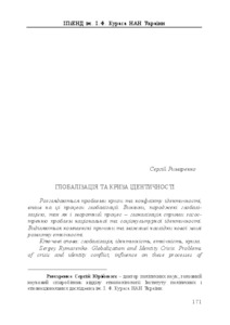 - Римаренко, Сергій (orcid.org/0000-0002-8031-5787) (2017) Globalization and Identity Crisis Наукові записки Інституту політичних і етнонаціональних досліджень ім. І.Ф. Кураса НАН України, 5-6 (91-92). pp. 171-181. ISSN 2524-0137