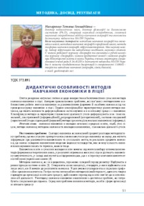 - Назаренко, Тетяна Геннадіївна (2018) Didactic specificity of economics teaching methods in high school Український педагогічний журнал, 2. pp. 51-58. ISSN 2411-1317