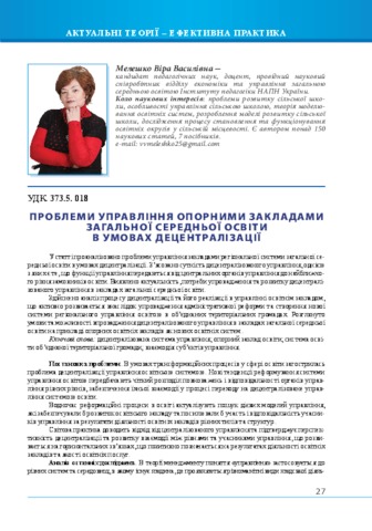 The article analyzes the problems of managing the institutions of the regional system of general secondary education in conditions of decentralization. The essence of decentralized management has been clarified, one of which is that management functions are transferred from central government bodies to the closest damage to education customers. The urgency of introduction and development of decentralized management in the system of general secondary education is revealed. The analysis of the process of decentralization and its implementation in the management of educational institutions is carried out, which is actively developing as a result of the introduction of administrative reform and the creation of a new system of regional education management in the joint territorial communities. Conditions and possibilities of introduction of decentralized management in institutions of general secondary education are considered on the example of basic educational institutions as new educational systems.