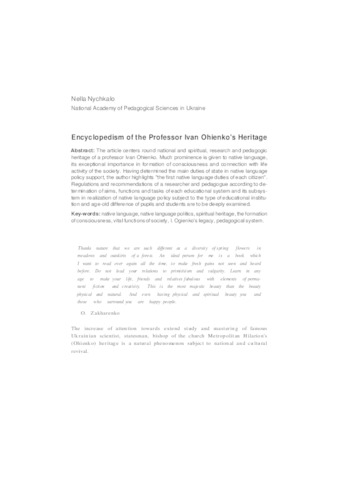 - Nychkalo, Nellia (orcid.org/0000-0002-5989-5684) (2013) Encyclopedism of the Professor Ivan Ohienko's Heritage European ideas in the pedagogical throught: from national to supranational points of view (some totalitarian aspects) (43). pp. 39-51.
