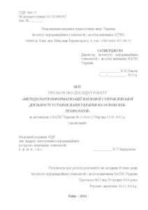 The research work "Methodology of informatization of scientific and administrative activity of institutions of the National Academy of Sciences of Ukraine on the basis of web technologies" is finished. Object of research - informatization of scientific and administrative activity of the institutions of the National Academy of Sciences of Ukraine. The subject of research - IS "Scientific research" as a means of informatization of the scientific institution of the National Academy of Sciences of Ukraine. The purpose of the work is to develop the methodology of informatization of scientific and management activities of the institutes of the National Academy of Sciences of Ukraine. The main results of the study are the definition of the conceptual foundations of informatization of scientific and management activities of the institutes of the National Academy of Sciences of Ukraine, definition of principles, structure, models of business processes of the IS "Scientific researches", testing of the intranet model of the typical site of the scientific institution in the IC "Scientific researches", organization of designing and implementation of the site of the Institute of Information Technologies and Learning Tools of the National Academy of Sciences of Ukraine on the basis of the Internet model of a typical site of a scientific institution, implementation of work on the implementation of IS "Scientific research". "