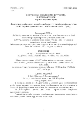 - Колупаєва, А.А. (orcid.org/0000-0002-4610-5081) (2017) The strategic vectors of changes and transformations in education of children with special needs underlines in Ukraine Освіта осіб з особливими потребами: шляхи розбудови (13). pp. 12-18. ISSN 2313-4011