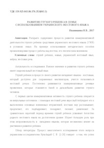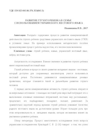 - Іванюшева, Н.В. (2017) Development of a deaf child in the family using the Ukrainian sign language Актуальні проблеми розвитку особистості в умовах міжкультурної взаємодії в освітньому просторі, 1. pp. 101-104.