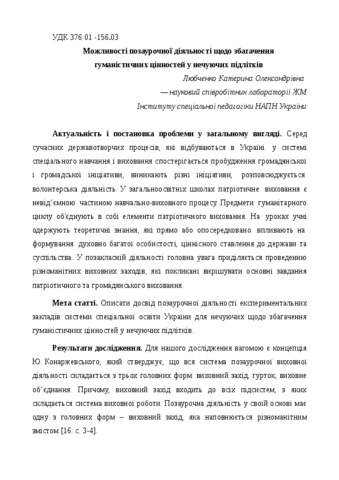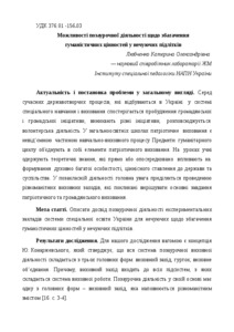 - Любченко, К.О. (2017) Possibilities of extra-curricular activities for enrichment humanistic values in helpless teenagers Актуальні проблеми розвитку особистості в умовах міжкультурної взаємодії в освітньому просторі, 1. pp. 54-59.