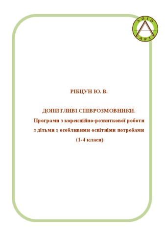 - Рібцун, Юлія Валентинівна (orcid.org/0000-0002-2672-3704) (2018) Curious interlocutors. Correctional-development work with children with special educational needs (1- 4 classes) [Teaching Resource] (Unpublished)