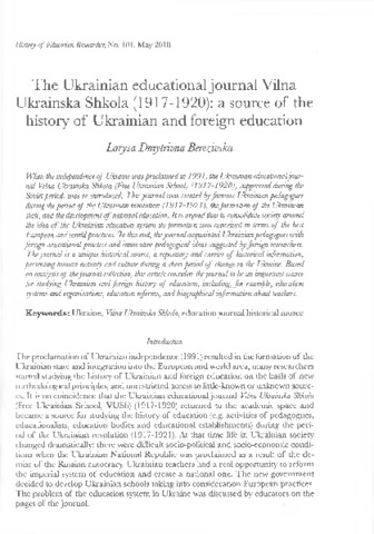 - Berezivska, L. D. (orcid.org/0000-0002-5068-5234) (2018) The Ukrainian educational journal Vilna Ukrainska Shkola (1917-1920): a source of the history of Ukrainian and foreign education History of Education Researcher (101). pp. 3-11. ISSN 1740-2433