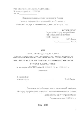- Іванова, С.М. (2014) Report on the research work "The system of scientific-organizational and technological support for the development of the network of electronic libraries of the institutions of the National Academy of Sciences of Ukraine" (final) Інститут інформаційних технологій і засобів навчання НАПН України, м. Київ, Україна. (Unpublished)