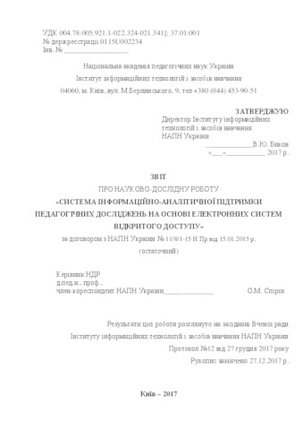 - Іванова, С.М., Яцишин, А.В. (orcid.org/0000-0001-8011-5956) and Спірін, О.М. (orcid.org/0000-0002-9594-6602) (2017) Report on the research work "The system of informational and analytical support of pedagogical researches on the basis of electronic open access systems" (final) Інститут інформаційних технологій і засобів навчання НАПН України, м. Київ, Україна. (Unpublished)