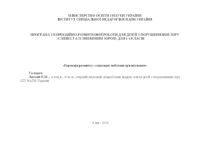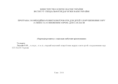 - Легкий, О.М. (2018) Program for correctional development work for children with visual impairment (blind and low vision) for 1-4 classes: "Correction of development: social and domestic orientation" [Teaching Resource]
