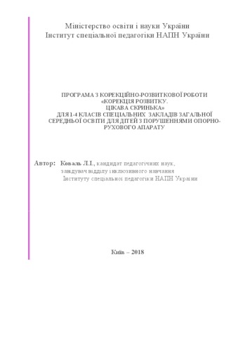 - Коваль, Людмила Вікторівна (orcid.org/0000-0002-3342-8922) (2018) The program from the correctional and developmental work «Correction of the development. Interesting box» for grades 1-4 of the special institutions of general secondary education for children with impaired musculoskeletal system [Teaching Resource]