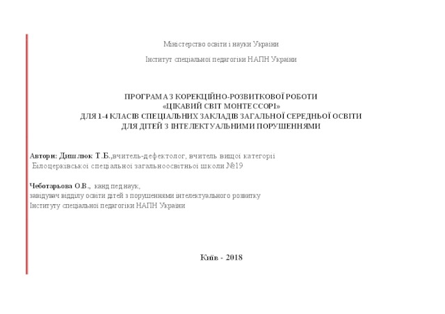 - Дишлюк, Т.Б. and Чеботарьова, О. В. (orcid.org/0000-0002-4560-3708) (2018) The program from the correctional and developmental work "An interesting world of Montessori" for grades 1-4 of the special institutions of general secondary education for children with intellectual disabilities [Teaching Resource]