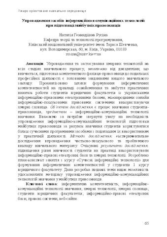 - Русіна, Н.Г. (2015) Implementation of information and communication technologies when preparing future lawyers Новітні комп’ютерні технології. Спецвипуск «Хмарні технології в освіті» (13). pp. 65-77. ISSN 2309-1460