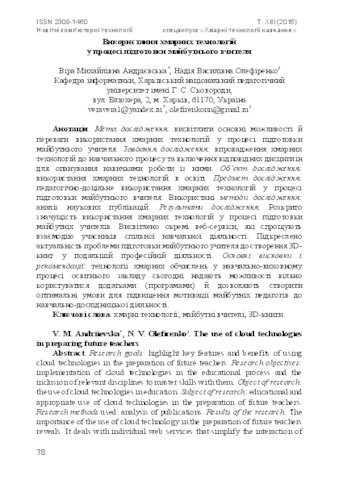 Research goals: highlight key features and benefits of using cloud technologies in the preparation of future teachers. Research objectives: implementation of cloud technologies in the educational process and the inclusion of relevant disciplines to master skills with them. Object of research: the use of cloud technologies in education. Subject of research: educational and appropriate use of cloud technologies in the preparation of future teachers. Research methods used: analysis of publications. Results of the research. The importance of the use of cloud technology in the preparation of future teachers reveals. It deals with individual web services that simplify the interaction of participants of joint training activities. The relevance of the training of teachers to create 3D-books in the future professional activity underlined. The main conclusions and recommendations: cloud technologies in the educational process in educational institutions today provide opportunities to freely use applications (programs) and allow to create optimal conditions for increasing the motivation of future teachers for teaching and research.