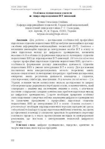 - Олійник, Т.О. (2015) Features of the teacher training as leader of the implementation of ICT innovations Новітні комп’ютерні технології. Спецвипуск «Хмарні технології в освіті» (13). pp. 88-95. ISSN 2309-1460