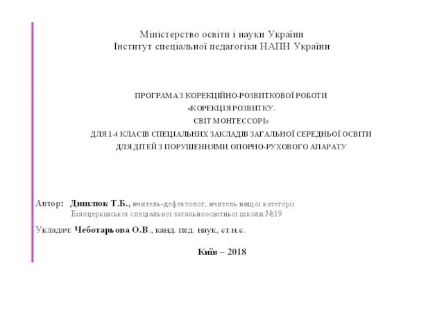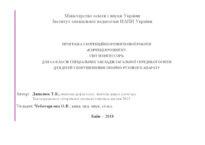 - Дишлюк, Т.Б. and Чеботарьова, О. В. (orcid.org/0000-0002-4560-3708) (2018) The program from the correctional and developmental work "Correction of the development. World of Montessori" for grades 1-4 of the special institutions of general secondary education for children with impaired musculoskeletal system [Teaching Resource]