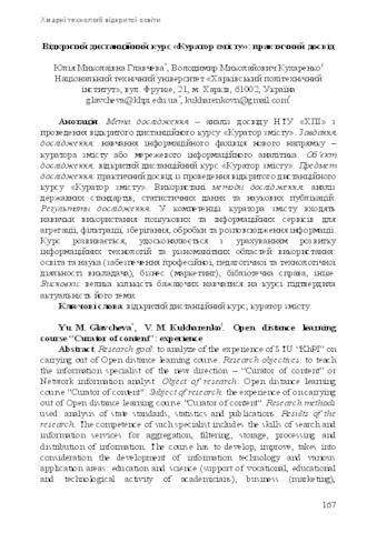 - Главчева, Ю.М. and Кухаренко, В.М. (2015) Open distance learning course “Curator of content”: experience Новітні комп’ютерні технології. Спецвипуск «Хмарні технології в освіті» (13). pp. 167-171. ISSN 2309-1460