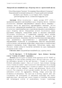 Research goal: to analyze of the experience of STU “KhPI” on carrying out of Open distance learning course. Research objectives: to teach the information specialist of the new direction – “Curator of content” or Network information analyst. Object of research: Open distance learning course "Curator of content". Subject of research: the experience of on carrying out of Open distance learning course "Curator of content". Research methods used: analysis of state standards, statistics and publications. Results of the research. The competence of such specialist includes the skills of search and information services for aggregation, filtering, storage, processing and distribution of information. The course has to develop, improve, takes into consideration the development of information technology and various application areas: education and science (support of vocational, educational and technological activity of academicians), business (marketing), librarianship and others. Conclusions: the relevance of subject of course is testified by a great number of those who wish to study the course.