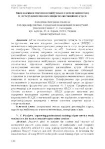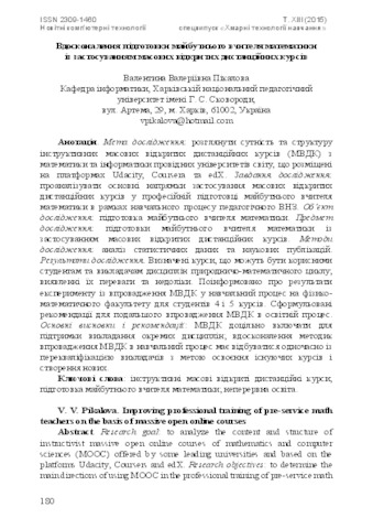 - Пікалова, В.В. (2015) Improving professional training of pre-service math teachers on the basis of massive open online courses Новітні комп’ютерні технології. Спецвипуск «Хмарні технології в освіті» (13). pp. 180-189. ISSN 2309-1460