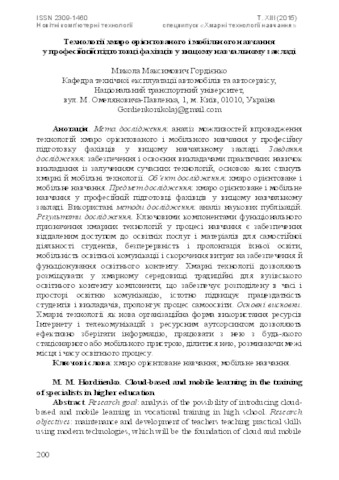 - Гордієнко, М.М. (2015) Cloud-based and mobile learning in the training of specialists in higher education Новітні комп’ютерні технології. Спецвипуск «Хмарні технології в освіті» (13). pp. 200-206. ISSN 2309-1460