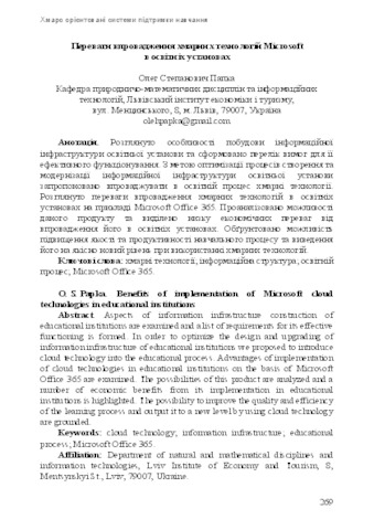 - Папка, О.С. (2015) Benefits of implementation of Microsoft cloud technologies in educational institutions Новітні комп’ютерні технології. Спецвипуск «Хмарні технології в освіті» (13). pp. 269-273. ISSN 2309-1460
