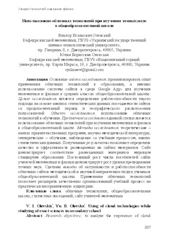 - Олевський, В.І. and Олевська, Ю.Б. (2015) Using of cloud technologies while studying of exact sciences in secondary school Новітні комп’ютерні технології. Спецвипуск «Хмарні технології в освіті» (13). pp. 337-341. ISSN 2309-1460