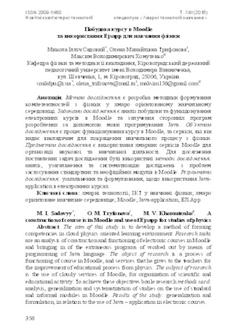 - Садовий, М.І., Трифонова, О.М. and Хомутенко, М.В. (2015) A construction of course is in Moodle and use of Ejsapp for studies of physics Новітні комп’ютерні технології. Спецвипуск «Хмарні технології в освіті» (13). pp. 356-360. ISSN 2309-1460