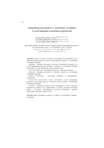 - Ткачук, В. В. (orcid.org/0000-0002-5879-5147), Єчкало, Ю.В. (orcid.org/0000-0002-0164-8365) and Маркова, О. М. (orcid.org/0000-0002-5236-6640) (2018) Augmented reality in education of students with special educational needs Proceedings of the 5th Workshop on Cloud Technologies in Education (2168). pp. 66-71. ISSN 1613-0073
