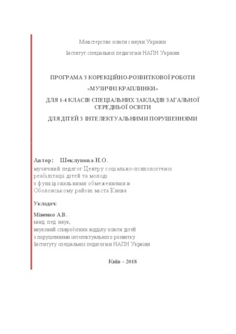 - Шеклунова, Н.О. and Міненко, А.В. (2018) The program from the correctional and developmental work «Musical droplets» for grades 1-4 of the special institutions of general secondary education for children with intellectual disabilities [Teaching Resource]