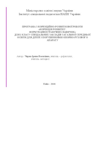 - Чорна, І.В. (2018) The program from the correctional and developmental work "Correction of the development. Formation of graphic skills" for grades 1 of the special institutions of general secondary education for children with impaired musculoskeletal system [Teaching Resource]