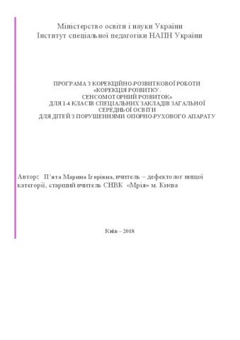 - П’ята, М.І. (2018) The program from the correctional and developmental work "Correction of the development. Sensorimotor development" for grades 1-4 of the special institutions of general secondary education for children with impaired musculoskeletal system [Teaching Resource]