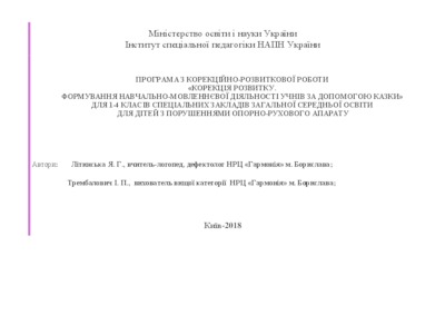 | Additional Information: | The program from the correctional and developmental work "Correction of the development.Formation of educational and speech activity of schoolboy with the help of fairy tales" for grades 1-4 of the special institutions of general secondary education for children with impaired musculoskeletal system". Рекомендовано Міністерством освіти і науки України (Наказ Міністерства освіти і науки №802 від 24.07.2018 р. «Про надання грифів Міністерства освіти і науки України навчальній літературі для дітей з особливими освітніми потребами») |