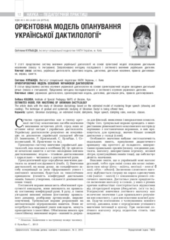 - Кульбіда, С.В. (orcid.org/0000-0002-0194-3495) (2013) Еstimated model for mastering of ukrainian Dactylology Дефектологія. Особлива дитина: навчання і виховання, 2. pp. 12-14. ISSN 2312-2781