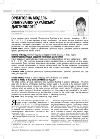 - Кульбіда, С.В. (orcid.org/0000-0002-0194-3495) (2013) Еstimated model for mastering of ukrainian Dactylology (continuation) Дефектологія. Особлива дитина: навчання і виховання, 3. pp. 10-15. ISSN 2312-2781