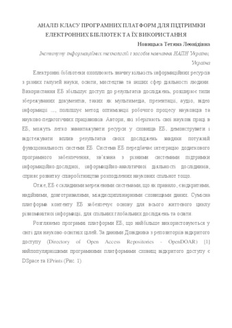 - Новицька, Т.Л. (orcid.org/0000-0003-2591-5218) (2018) Analysis of the class of software platforms for supporting digital libraries and their use In: Наука та освіта: ключові питання сучасності: матеріали Міжнародної науково-практичної конференції 18 травня 2018 року у м. Чернігів: зб. наук. праць «ΛΌГOΣ» , 10 . Друкарня «Друкарик» (ФОП Гуляєва В.М.), м. Обухів, Україна, pp. 7-10. ISBN 987-617-71717-80-4