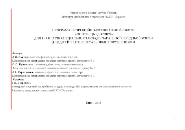 - Ковтун, Анатолій Володимирович, Кунникова, О.О., Стригунова, А.І. and Бобренко, Інна Всеволодівна (orcid.org/0000-0002-9501-5461) (2018) The program from the correctional and developmental work «Island of Health» for grades 1-4 of the special institutions of general secondary education for children with intellectual disabilities [Teaching Resource]