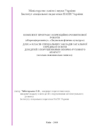 - Чеботарьова, О. В. (orcid.org/0000-0002-4560-3708) (2018) The set of programs from the correctional and developmental work ("Correction of the development", «Exercise therapy») for grades 1-4 for children with impaired musculoskeletal system (general explanatory note) [Teaching Resource]