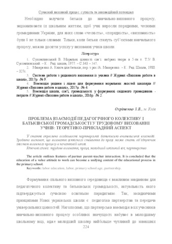 - Охріменко, З.В. (orcid.org/0000-0001-7217-100X) (2018) The problem of the interaction of the pedagogical staff and the parental community in the labor education of students: the theoretical and applied aspect In: Матеріали звіт. наук.-практ. конф. Ін-ту проблем виховання НАПН України за 2017 рік «Сучасний виховний процес: сутність та інноваційний потенціал» (м. Київ, 18 квітня 2018 р.) , 2018 (6). НАІР, м. Івано-Франківськ, Україна, pp. 224-228.