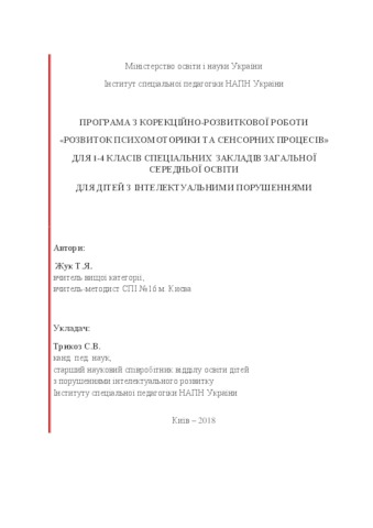 - Жук, Т.Я. and Трикоз, С. В. (orcid.org/0000-0002-5929-589X) (2018) The program from the correctional and developmental work «The development of psychomotor and sensory processes» for grades 1-4 of the special institutions of general secondary education for children with intellectual disabilities [Teaching Resource]