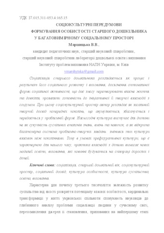 - Маршицька, В.В. (orcid.org/0000-0002-7072-8844) (2018) Socio-cultural preconditions for the formation of the personality of a senior preschooler in a multidimensional social space. Актуальні проблеми психології. Психологія розвитку дошкільника, 14 (4). pp. 196-207. ISSN 2072-4772
