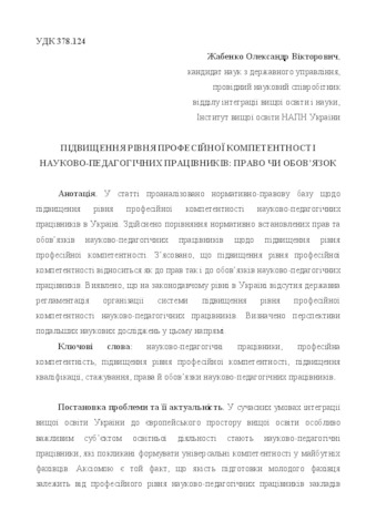 - Жабенко, О.В. (orcid.org/0000-0001-5257-1743) (2017) Increasing the level of professional competence of scientific-pedagogical employees: the right or duty Молодий вчений, 10 (50). pp. 432-438. ISSN 2304-5809