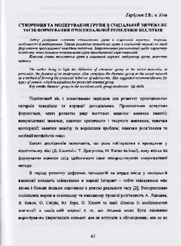 - Гарбузюк, І.В. (2018) Creation and moderation of the group in the social network as a means of forming prosocial behavior of adolescents In: Сучасний виховний процес: сутність та інноваційний потенціал: матеріали звіт. наук.-практ. конф. Ін-ту проблем виховання , 6 . НАІР, м. Івано-Франківськ, Україна, pp. 67-69.