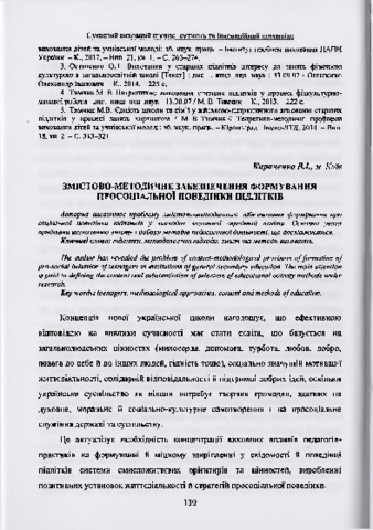 - Кириченко, В. І. (2018) Content-methodological support for the formation of prosocial behavior of adolescents In: Сучасний виховний процес: сутність та інноваційний потенціал: матеріали звіт. наук.-практ. конф. Ін-ту проблем виховання (6). НАІР, м. Івано-Франківськ, Україна, pp. 130-133.