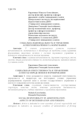 - Кириченко, М.О. (orcid.org/0000-0003-1756-9140) and Дмитренко, Геннадій Анатолійович (2016) Social responsibility in administration: aspects of determination and forming Вісник післядипломної освіти, 1 (30). pp. 47-65.