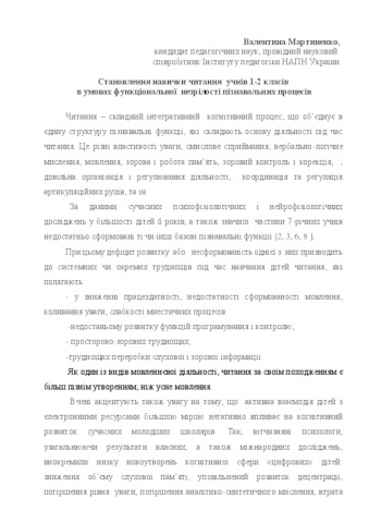 - Мартиненко, Валентина Олександрівна (2018) Becoming a pupils reading skills 1-2 classes in conditions of functional immaturity of cognitive processes Початкова школа, 6 (588). pp. 27-31. ISSN 0131-5358