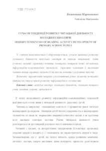 The article enlightens and proves modern tendencies of reading activity development of primary school pupils in such directions: change of modern models (practices) of reading, reading interests of children under the influence of information and communication technologies. The essence of concepts is revealed: texts of new nature, media text, reading from screen. Positive and negative aspects of influence of screen technologies on the quality of reading and understanding texts are outlined.