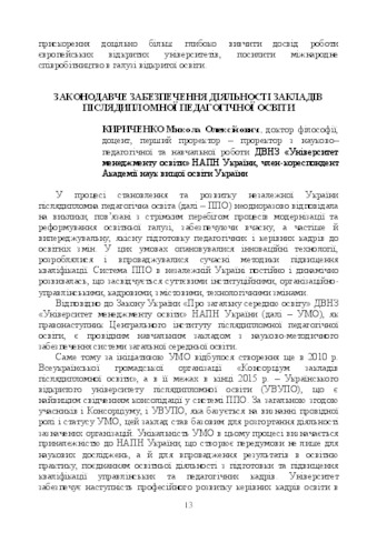 - Кириченко, М.О. (orcid.org/0000-0003-1756-9140) (2017) Legislative support of activity of institutions of postgraduate pedagogical education Науково-методичні основи професійного розвитку керівних і педагогічних кадрів в умовах випереджувальної післядипломної освіти : збірник наукових праць за матеріалами Всеукраїнської науково - практичної конференції 30-31 березня 2017 року. pp. 13-16.