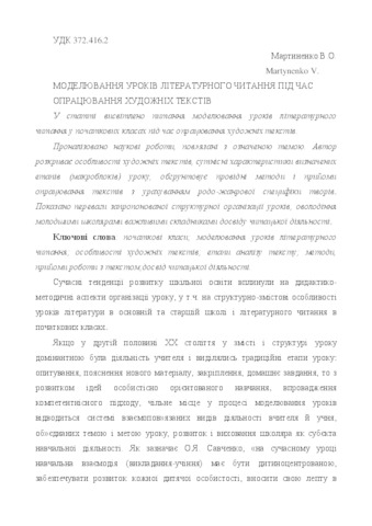 - Мартиненко, Валентина Олександрівна (2015) Мodelling literary readings lessons in the process of fiction texts comprehension Педагогічна освіта: теорія і практика, 1/2 (19). pp. 154-160. ISSN 2309-9763