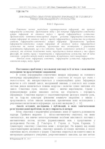 - Кириченко, М.О. (orcid.org/0000-0003-1756-9140) (2017) Information and semiotic information measurements as the main modus and the trend of information society Гуманітарний вісник Запорізької державної інженерної академії (68). pp. 57-67. ISSN 2072-7941