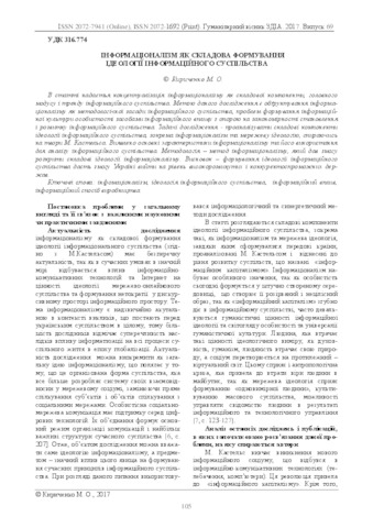 - Кириченко, М.О. (orcid.org/0000-0003-1756-9140) (2017) Informatiology as a component of formation of ideology of information society Гуманітарний вісник Запорізької державної інженерної академії (69). pp. 105-111. ISSN 2072-7941