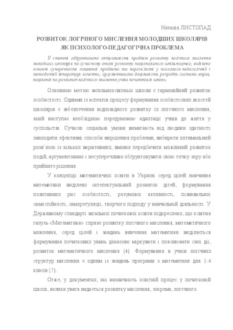 - Листопад, Наталія Петрівна (2008) The development of the logical thinking of the elementary school peuples as psychologico-pedagogical problem Наукові записки Тернопільського національного педагогічного університету імені Володимира Гнатюка. Серія: педагогіка, 6. pp. 133-135.